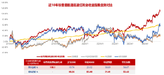 数据来源标普道琼斯指数有限公司、中证指数公司、Wind,数据统计区间为2015.4.1-2025.3.31;本基金标的指数为标普港股通低波红利指数,其基日为2011.1.31,发布日期为2017.2.20标普港股通低波红利全收益指数(将成份股分红计入收益)近5个完整年度(2020-2024)的涨跌幅分别为:-19.86%14.21%3.47%5.35%34.16%。指数成份股构成根据该指数编制规则适时调整,指数的过往走势与回测业绩并不预示其未来表现,亦不构成基金未来业绩表现的保证。市场有风险,投资须谨慎!