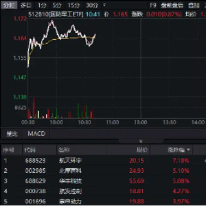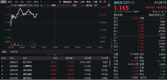 热门ETF方面,国防军工ETF512810)场内价格一度涨超1%,现涨0.87%