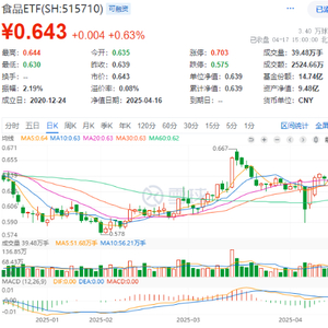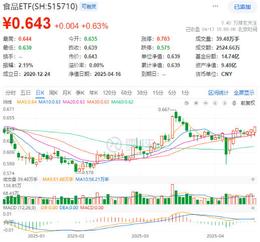今日(4月17日),吃喝板块延续上攻态势,反映吃喝板块整体走势的食品ETF(515710)开盘后全天震荡上行,截至收盘,场内价格涨0.63%,日线三连阳。