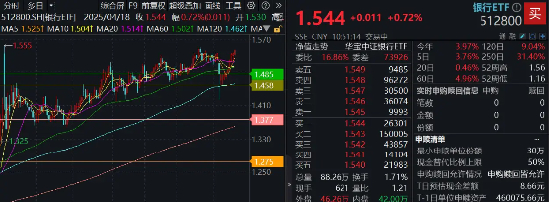 A股顶流银行ETF(512800)低开高走,场内价格逆市上涨0.72%,日线稳步9连阳,彰显超强防御性。