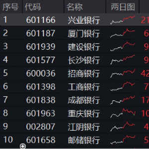 银行板块再走强,全天力挺大盘,工、农、中、建四大行盘中均创出历史新高,兴业银行、厦门银行、长沙银行、招商银行等涨幅居前。
