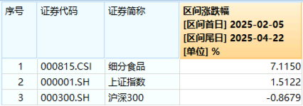 注:统计区间为2025年2月5日-2025年4月22日,细分食品指数近5个完整年度涨跌幅分别为:2020年,91.99%;2021年,-8.3%;2022年,-15.27%;2023年,-19.84%;2024年,-6.12%。指数成份股构成根据该指数编制规则适时调整,其回测历史业绩不预示指数未来表现。