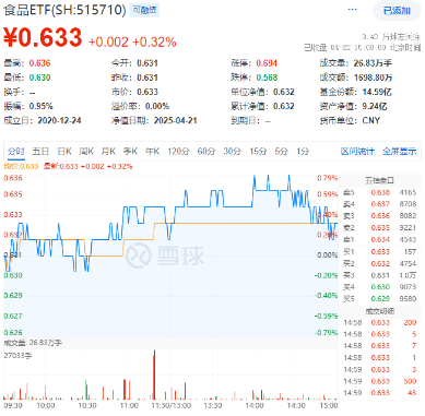 今日(4月22日),吃喝板块震荡上行,反映吃喝板块整体走势的食品ETF(515710)盘中场内价格最高涨0.79%,尾盘略有回落,截至收盘,涨0.32%。