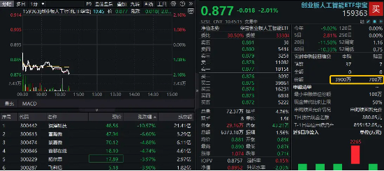 热门ETF方面,重仓算力软件+硬件创业板人工智能ETF华宝(159363)早盘震荡下挫,场内价格下跌2%,实时成交额超6300万元,盘中持续溢价交易,资金实时净申购3200万份,资金借道ETF逢低布局创业板人工智能意愿明显。