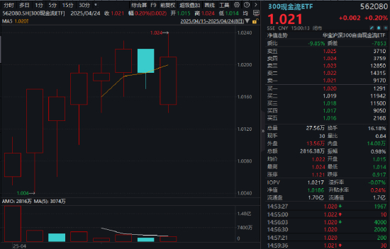 ETF方面,目前全市场已上市的跟踪300现金流指数的ETF有且仅有1只——300现金流ETF(562080)。从日k走势来看,截至收盘,300现金流ETF上市8个交易日中有7日收出阳线,今日盘中最高价上探1.024元,再创上市以来新高。