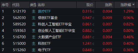 从场内热门ETF来看,AI医疗、CXO概念联袂带动下,医疗ETF(512170)场内涨1.29%。科技领域多点开花,信创ETF基金(562030)场内反弹0.96%,大数据产业ETF(516700)亦收涨,“AI双子星”——创业板人工智能ETF华宝(159363)、科创人工智能ETF华宝(589520)场内双双涨逾0.8%。