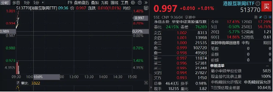 4月30日,恒科指小幅高开0.21%,科网板块明显更强,截至发稿,重仓港股互联网龙头的港股互联网ETF(513770)场内价格涨逾1%,美团-W、阿里巴巴-W、快手-W、腾讯控股集体飘红。