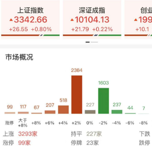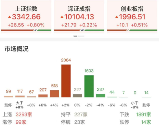 今日A股全天维持高位整理,量能逐步放大,军工股引领市场。上证指数放量收涨0.8%报3342.67点,深证成指涨0.22%,创业板指涨0.51%,中证A500涨0.51%。A股成交1.51万亿,上日成交1.36万亿。