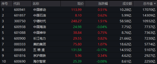 成份股方面,万亿市值巨头中国移动、中国石油、宁德时代集体上涨,中国神华、长江电力、美的集团等大市值“现金牛”悉数收红。下跌方面,中兴通讯、中国铝业、分众传媒跌逾1%居前。