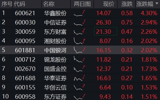 券商股集体走强,28股涨逾1%,中信证券、东方财富、中国银河涨超2%,华鑫股份涨逾4%。