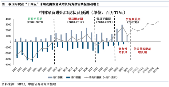 我国军贸在短期内有望持续增长,并在“十四五”末期由恢复式增长向供需共振驱动增长转变,武器装备发展重心向装备体系化与集团化方向发展。