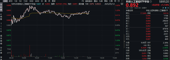 今日(5月12日)自主可控方向表现活跃,重点布局国产AI产业链的科创人工智能ETF华宝(589520)场内涨幅盘中上探1.59%,现涨1.13%,其标的指数自本轮低点(4月8日)以来累计涨超17%。