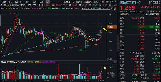国防军工板块代表性ETF——国防军工ETF(512810)盘中最高涨至5.95%,场内价格收涨4.79%报1.269元,涨幅跻身全市场ETF前五,收盘价格创2024年11月15日以来新高!放量成交1.76亿元,创近1个半月新高。