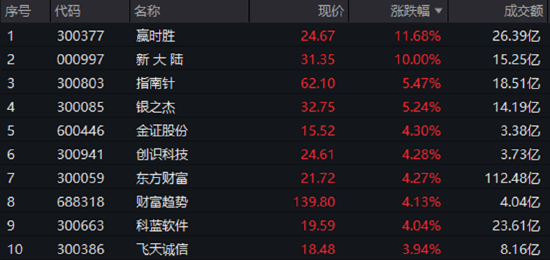 周一(5月12日),受市场重磅预期影响,大金融午后走高!金融科技指数一举上涨超3%,超九成成份股收红!其中,赢时胜大涨超11%,新大陆涨停,指南针、银之杰等涨超5%,金证股份、创识科技、东方财富、财富趋势、科蓝软件等多股跟涨超4%,其中东方财富成交额达112亿元,居全市场第一!