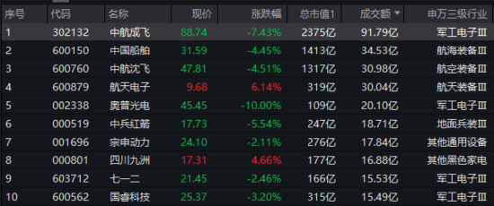 突然刹车!什么原因?国防军工热度仍高,中航成飞成交逾91亿元蝉联A股第二,512810大跌3%全天溢价交易!