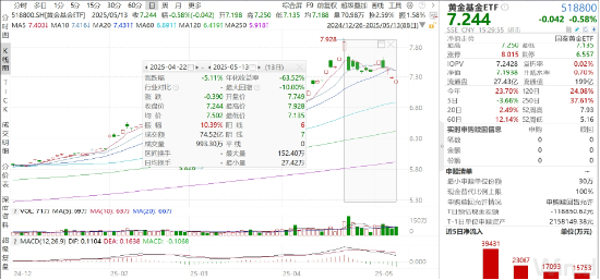 金价近期冲高回落,黄金基金ETF(518800)今日收跌0.58%。