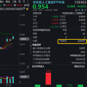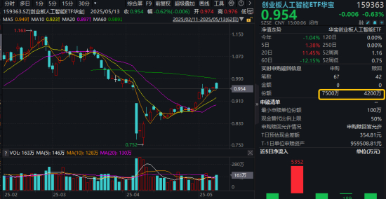 周二(5月13日),市场预期高涨之际,A股意外震荡洗盘。市场全天高开低走,三大指数涨跌不一,两市缩量成交1.29万亿元。盘面上,市场热点较为杂乱,个股跌多涨少。热门赛道方面,AI产业链普遍调整,创业板人工智能ETF华宝(159363)场内震荡走低收跌0.63%,放量成交1.57亿元,资金逢跌净申购3300万份。