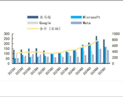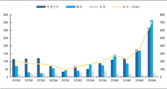 1、需求侧,全球互联网云厂持续加大资本开支。2025年一季度,海外四大云厂商及Meta资本开支显著增加。国内云厂需求:互联网云巨头资本开支持续提升。2024年国内三大云厂商资本开支呈现同持续提升态势,2024Q4三大互联网厂商资本开支合计708亿元(同比+252%,环比+95%)。