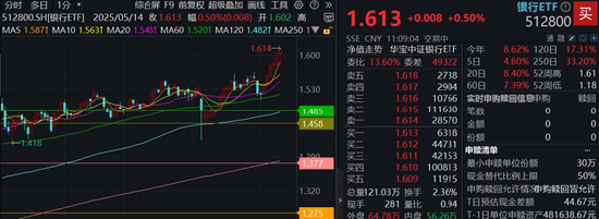 热门ETF方面,银行ETF(512800)场内价格上涨0.5%,再创上市新高,实时成交额近2亿元。