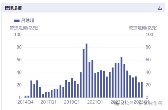 吕越超累计任职时间10年又29天,可谓是基金老将,目前管理基金规模25.40亿元,在管基金最佳任期回报44.71%。笔者翻看其管理规模,在2020年2季度吕经理管理规模高达86.75亿元,2022年1季度降到34.31亿元,2023年2季度又升至65.44亿元,之后吕经理旗下基金规模出现下降,2024年2季度降至32.93亿元,到了2025年1季度已经降至25.40亿元。