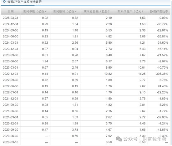 基金业绩下降,基金规模也会下降。海富通科技创新混合A基金成立之初募集了8.5亿元,但成立后不久,基金份额就被赎回,2020年3季度被赎回3.79亿份,2020年4季度被赎回1.29亿份。2023年1季度被赎回2.49亿份,2023年2季度被赎回2.67亿份。之后仍有基金份额被赎回,截至2025年3月31日,海富通科技创新混合A,期末净资产1.53亿元,比上期减少0.03%。