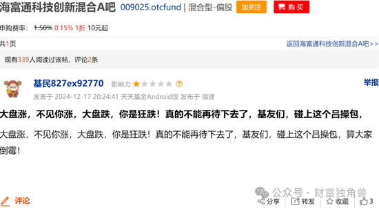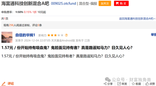 基金业绩差,有基民表示,亏损最严重的一只!太恶心了,就不能争气一点吗?也有基民表示,大盘涨,不见你涨,大盘跌,你是狂跌!真的不能再待下去了,基友们,碰上这个经理,算大家倒霉!甚至有基民表示,1.57元/份开始持有吸血鬼?真是路遥知马力?日久见人心?公司对这样的基金经理若视而不见,那公司的信誉也就快崩塌了!
