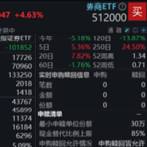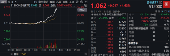 ETF方面,A股顶流券商ETF(512000)场内价格飙涨4.63%,银行ETF(512800)涨逾1%,交投活跃。
