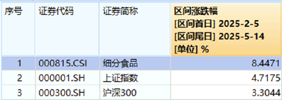 注:统计区间为2025年2月5日-2025年5月14日,细分食品指数近5个完整年度涨跌幅分别为:2020年,91.99%;2021年,-8.3%;2022年,-15.27%;2023年,-19.84%;2024年,-6.12%。指数成份股构成根据该指数编制规则适时调整,其回测历史业绩不预示指数未来表现。