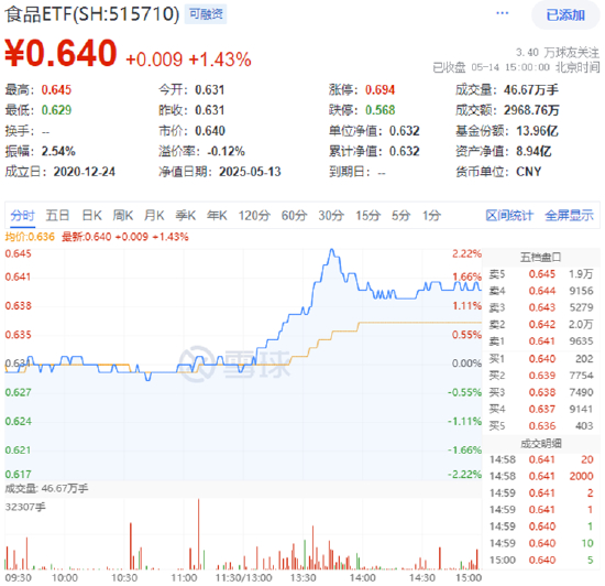今日,在白酒龙头的带领下,吃喝板块午后猛拉,反映吃喝板块整体走势的食品ETF(515710)午后直线拉升,盘中场内价格涨幅一度达到2.22%,截至收盘,涨1.43%。