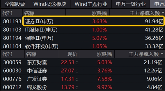 资金面明显涌入,今日证券板块获主力资金净流入91.94亿元,高居所有申万二级行业断层第一!东方财富获大举增仓21.19亿元,中信证券吸金12.26亿元,其次是广发证券净流入超9亿元。