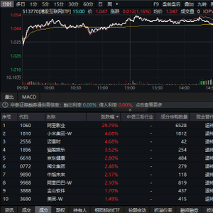 个股方面,阿里影业飙涨29.79%,小米集团大涨4.68%,阿里巴巴、京东健康、美团等涨幅居前。