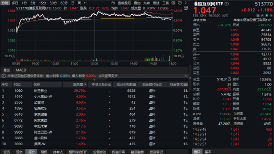 今日(5月20日),港股气势如虹,三大指数集体收涨。截至收盘,恒生指数涨1.49%,恒生科技指数涨1.15%。科网龙头大面积走强,重仓港股互联网龙头的港股互联网ETF(513770)盘中场内价格最高涨幅达到1.74%,截至收盘,涨1.16%。