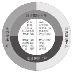 经济增长与通货膨胀是“全天候策略”进行决策的两大基础指标。以市场预期为基准,“全天候策略”将宏观经济环境划分为四种状态:增长超预期、增长不及预期、通货膨胀超预期、通货膨胀不及预期,并统计出四种状态下历史表现较好的几种资产类别。