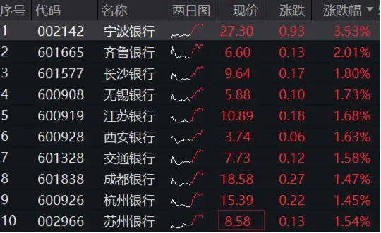 板块个股集体飘红,宁波银行领涨逾3%,齐鲁银行涨超2%,江苏银行、交通银行、中信银行等17股涨逾1%。