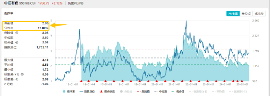 从估值水平来看,截至今日,中证有色金属指数市净率为2.05,位于上市以来17.89%分位点的历史较低位置,低于中证有色金属指数上市以来周频市净率数据的中位数2.53,估值较低,配置性价比较高。
