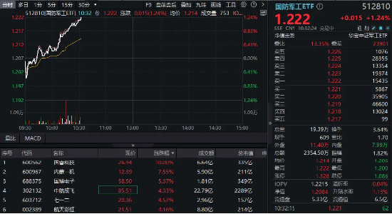 特朗普祭出1750亿美元“金穹”计划,22日早盘,A股国防军工热度迅速飙升,场内热门国防军工ETF(512810)低开高走,持续拉升,现涨1.24%,成份股国睿科技涨停,内蒙一机、国博电子大幅跟涨。截至发稿深成指、创指均飘绿。