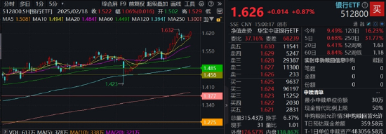 A股顶流银行ETF(512800)低开高走,场内价格一度涨近1%,收涨0.87%,日线稳步3连阳,全天成交额5.11亿元,环比放量1.16亿。