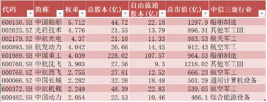 图:中证军工指数前十大成分股