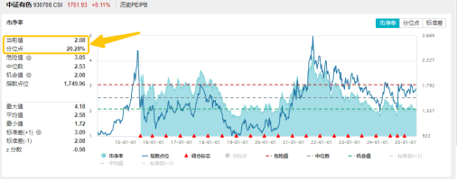 从估值水平来看,截至周五,中证有色金属指数市净率为2.08,位于上市以来20.28%分位点的历史较低位置,低于中证有色金属指数上市以来周频市净率数据的中位数2.53,估值较低,配置性价比较高。