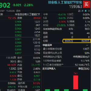 热门ETF方面,全市场首只的创业板人工智能ETF华宝(159363)场内收跌2.28%,失守所有均线,放量成交1.22亿元。值得注意的是,伴随着短线跳水,该ETF持续溢价交易,表明买盘资金强势,实时申购数据显示,资金全天净申购4000万份。