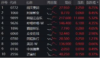 港股冲高回落,科网板块走势分化,个股局部活跃,阿里影业盘中一度涨逾21%,收涨逾8%,带动文娱概念股集体走强,阅文集团、网易云音乐涨幅居前;哔哩哔哩-W涨超4%,一季度扭亏为盈,超市场预期。此外,美团-W、腾讯控股跟涨飘红;快手-W、阿里巴巴-W、小米集团-W微跌报收。