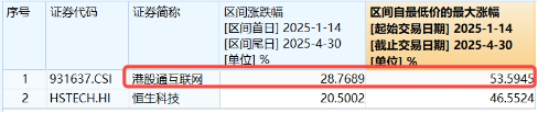 变局时刻,把握港股核心科网龙头。港股互联网ETF(513770)及其联接基金(A类 017125;C类 017126)被动跟踪中证港股通互联网指数,通过重仓港股互联网龙头,成为本轮港股科技行情的高效投资利器。数据显示,本轮行情启动以来至4月末,中证港股通互联网指数累计涨幅超28%,明显优于恒指、恒科指同期表现,区间最大涨幅更是高达53.59%,领涨弹性突出。