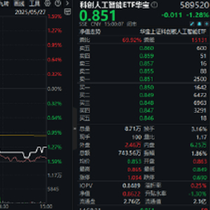 今日(5月27日)A股主要指数集体收跌,两市成交额不足万亿元,重点布局国产AI产业链的科创人工智能ETF华宝(589520)随市回调,全天跌幅震荡扩大,场内价格最终收跌1.28%。