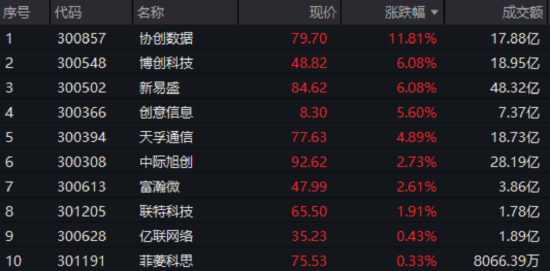 成份股方面,AIDC算力产业链概念股逆市上涨,算力租赁、光模块等细分赛道表现亮眼,其中协创数据领涨11.81%,博创科技、新易盛涨逾6%,天孚通信、中际旭创、富瀚微等涨超2%;AI应用概念股则随市调整,昆仑万维、东土科技领跌超5%。