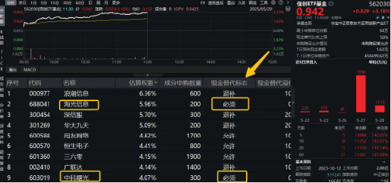 5月26日(周一),信创ETF基金(562030)成份股中,海光信息、中科曙光现金替代标志为“允许”,还可以按照上述方式套利。但当前(5月29日,周四),信创ETF基金(562030)成份股中,海光信息、中科曙光现金替代标志为“必须”,已经不可以通过上述方式进行套利了。(详见下方行情图)切记!!!不要无脑操作。