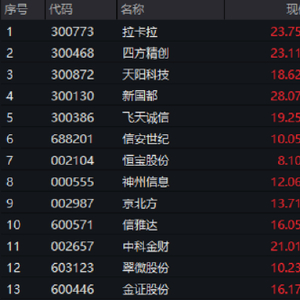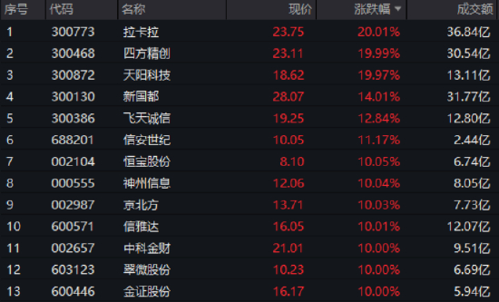 周四(5月29日),金融科技板块领涨全市场,数字货币、跨境支付等细分主题概念爆发涨停潮,中证金融科技主题指数大幅反弹超5.5%,10只成份股涨停!拉卡拉、四方精创、天阳科技20CM涨停,恒宝股份、神州信息、京北方、信雅达、中科金财、翠微股份、金证股份等封板,新国都、飞天诚信、信安世纪等多股涨超10%。