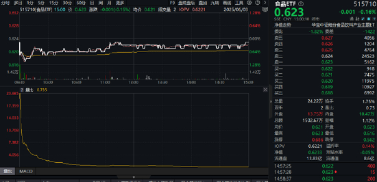 今日(6月3日),吃喝板块震荡回调,反映吃喝板块整体走势的食品ETF(515710)全天维持低位震荡,截至收盘,场内价格跌0.16%。