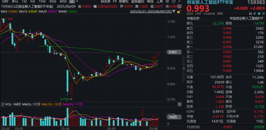 热门ETF方面,同标的指数规模较大、流动性较好的创业板人工智能ETF华宝(159363)全天高开高走,场内价格收涨2.06%,日线五连阳!全天成交额达1.66亿元,环比放量明显。