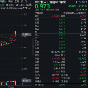 热门ETF方面,同标的指数规模较大、流动性较好的创业板人工智能ETF华宝(159363)午后急速跳水,场内价格一度下挫逾3.5%回踩五日线,收盘跌幅缩窄至2%成功守住5日线,全天成交额达1.44亿元。