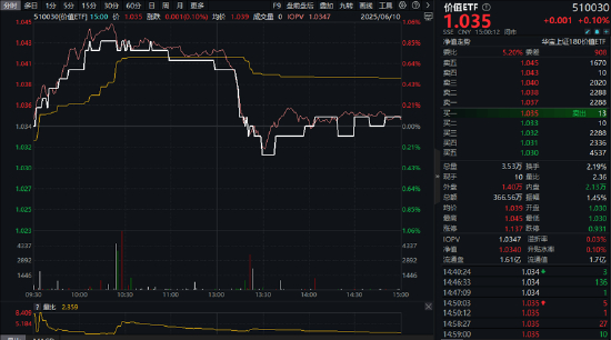 今日(6月10日),大盘震荡回调之际,部分高股息风格个股出手护盘。聚焦“高股息+低估值”大盘蓝筹股的价值ETF(510030)盘中场内价格涨幅一度达到1.06%,午后随市回落,截至收盘,逆市涨0.1%。